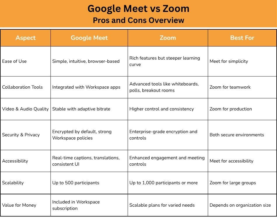 Google Meet suits teams using Google Workspace, while Zoom offers more features for large meetings and events. The best option depends on workflow needs.