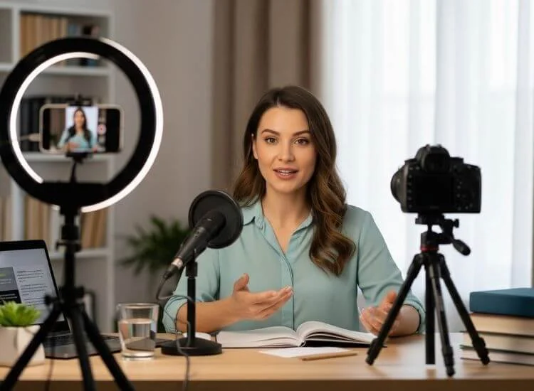 You need a clear microphone, simple lighting, a stable camera or smartphone, and a teleprompter app for organized delivery. These essentials help you record lessons that feel polished and easy to follow without building a full studio setup.